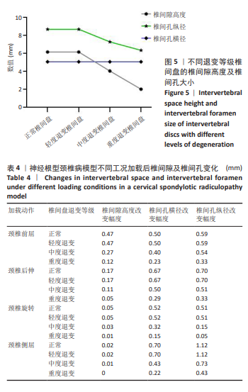 结果与结论:①神经根型颈椎病三维有限元模型造模成功后,除了椎间孔横径没有变化外,椎间隙高度及椎间孔纵径自中度椎间盘退变到重度椎间盘退变逐渐减小;②动态验证结果显示,加载不同工况后发现,中度和重度椎间盘退变的神经根型颈椎病三维有限元模型的椎间隙高度、椎间孔横纵径变化幅度减小,说明椎间孔的容积及容纳神经根的能力降低。所以此次研究构建的神经根型颈椎病有限元模型符合疾病的发病特征。