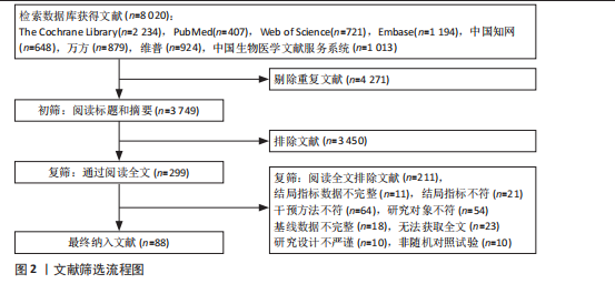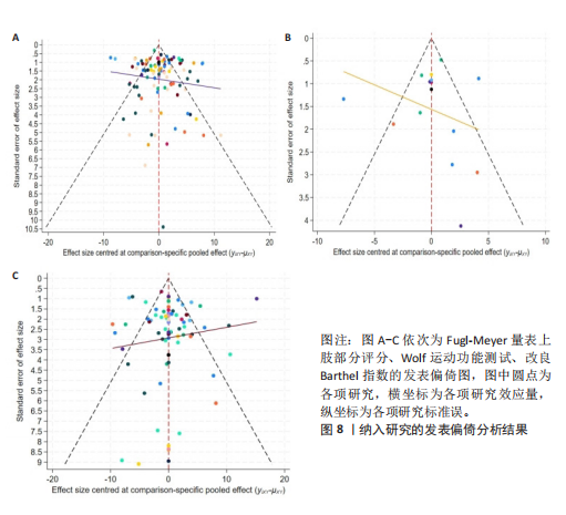 结果:①共纳入88篇研究,其中高质量82篇,低质量6篇,涉及5 561例脑卒中患者,共形成19种康复方案;②Fugl-Meyer评定量表上肢部分评分累积排序概率图下面积排序前8种康复方案:经颅直流电刺激+机器人(99.4%) >运动想象疗法+机器人(84.4%) >运动想象疗法+强制性运动疗法(82.8%) >镜像疗法+肌电生物反馈疗法(81.2%) >运动想象疗法+肌电生物反馈疗法(77.0%) >重复经颅磁刺激+强制性运动疗法(69.9%) >