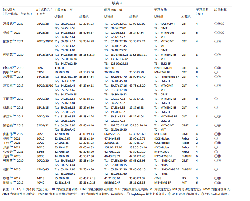 RESULTS: (1) A total of 88 studies were included, including 82 high-quality and 6 low-quality studies, involving 5 561 stroke patients, resulting in a total of 19 rehabilitation programs. (2) The Fugl-Meyer scale results indicated that the top eight rehabilitation programs, ranked by the area under the cumulative ranking probability chart, were transcranial direct current stimulation+robot (99.4%) > motor imagery therapy+robot (84.4%) > motor imagery therapy+constraint-induced movement therapy (82.8%) > mirror therapy+electromyography biofeedback (81.2%) > motor imagery therapy+electromyography biofeedback (77.0%) > repetitive transcranial magnetic stimulation+constraint-induced movement therapy (69.9%) > transcranial direct current stimulation+electromyography biofeedback (67.1%) > repetitive transcranial magnetic stimulation+electromyography biofeedback (60.2%). (3) Wolf motor function test results indicated that the top three rehabilitation programs, ranked by the area under the cumulative ranking probability chart, were constraint-induced movement therapy+transcranial direct current stimulation (70.7%) > constraint-induced movement therapy (65.3%) > transcranial direct current stimulation (63.4%). (4) Modified Barthel index results indicated that the top eight rehabilitation programs, ranked by the area under the cumulative ranking probability chart, were transcranial direct current stimulation+robot (95.4%) > transcranial direct current stimulation+electromyography biofeedback (82.3%) > motor imagery therapy+constraint-induced movement therapy (79.7%) > repetitive transcranial magnetic stimulation+constraint-induced movement therapy (79.5%) > functional electrical stimulation (74.2%) > motor imagery therapy+electromyography biofeedback (68.6%) > mirror therapy+robot (65.1%) > mirror therapy+electromyography biofeedback (51.0%).