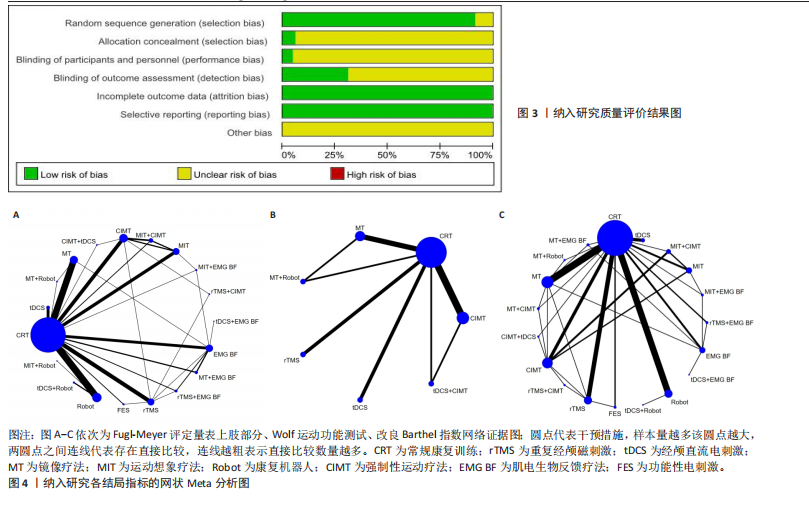 METHODS: A computer search of PubMed, Web of Science, Embase, The Cochrane Library, CNKI, WanFang, VIP, and the Chinese Biomedical Literature Database. The time period was from database inception to October 15, 2024. Randomized controlled trials of different central or peripheral rehabilitation methods alone or in combination on upper limb function and activities of daily living in stroke patients were collected. The risk of bias and methodological quality of the included literature were evaluated using the Cochrane Risk of Bias Assessment Tool and the revised Jadad scale. Network meta-analyses of Fugl-Meyer Assessment-Upper Extremity, Wolf motor function test and Modified Barthel index were performed using RevMan 5.4 and Stata 18. The strength of recommendation for the outcome metrics was assessed using the GRADE Level of Evidence system.