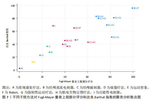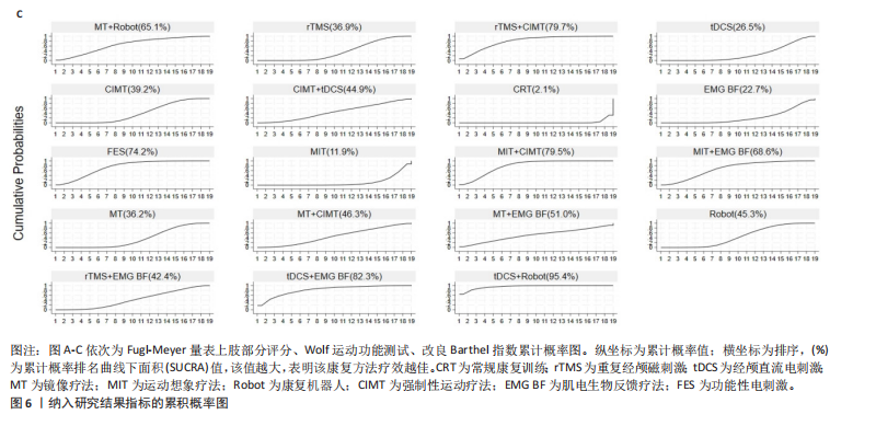 经颅直流电刺激+肌电生物反馈疗法(67.1%) >重复经颅磁刺激+肌电生物反馈疗法(60.2%);③Wolf运动功能测试累积排序概率图下面积排序前3种康复方案:强制性运动疗法+经颅直流电刺激(70.7%) >强制性运动疗法(65.3%) >经颅直流电刺激(63.4%);④改良Barthel指数累积排序概率图下面积排序前8种康复方案:经颅直流电刺激+机器人(95.4%) >经颅直流电刺激+肌电生物反馈疗法(82.3%) >运动想象疗法+强制性运动疗法(79.7%) >重复经颅磁刺激+强制性运动疗法(79.5%) >功能性电刺激(74.2%) >运动想象疗法+肌电生物反馈疗法(68.6%) >镜像疗法+机器人(65.1%) >镜像疗法+肌电生物反馈疗法(51.0%)。