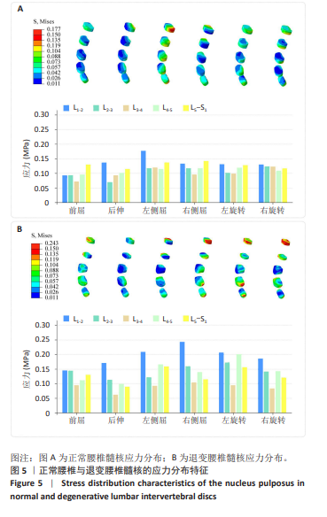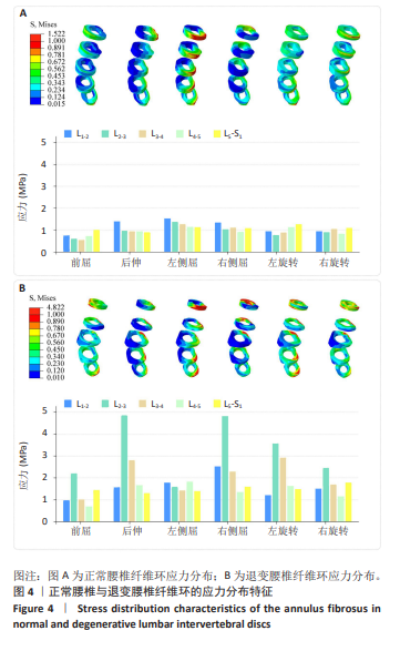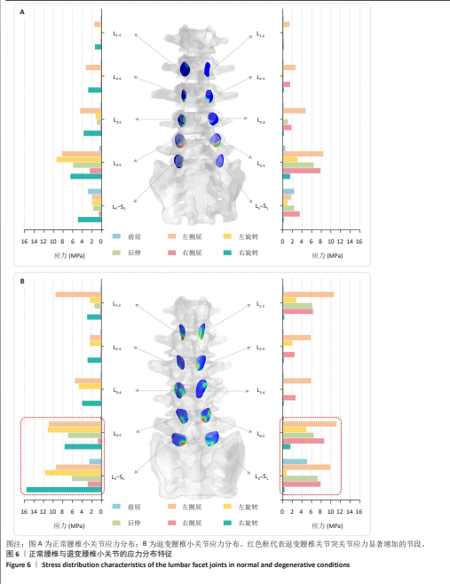 结果与结论:①退化腰椎整体活动范围和节段活动范围均出现了不同程度的下降,特别是在后伸和侧屈运动中,退化的腰椎表现出显著的活动受限;②腰椎的退化改变了力学的环境,邻近节段的椎骨、椎间盘与小关节应力均增大;③腰椎退变导致活动度下降,特别影响后伸和侧屈运动;④L4节段在退变后承受了更高的应力,可能是下腰痛的关键因素;⑤退变腰椎的力学负荷重分配对邻近节段影响显著。