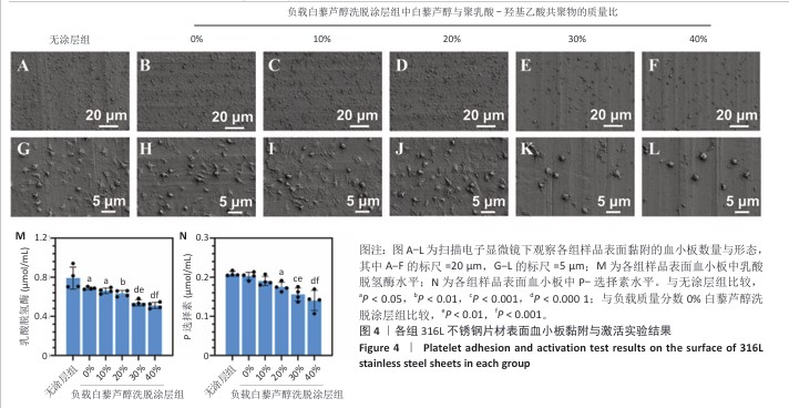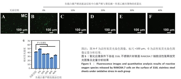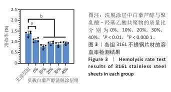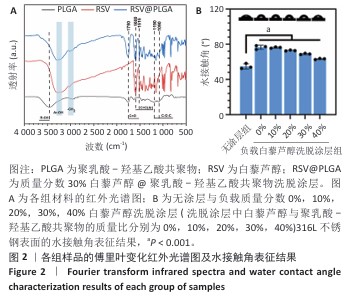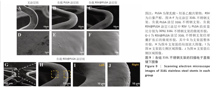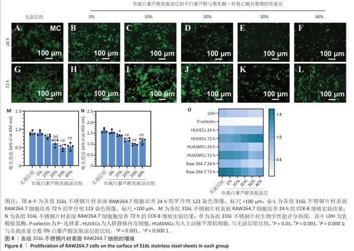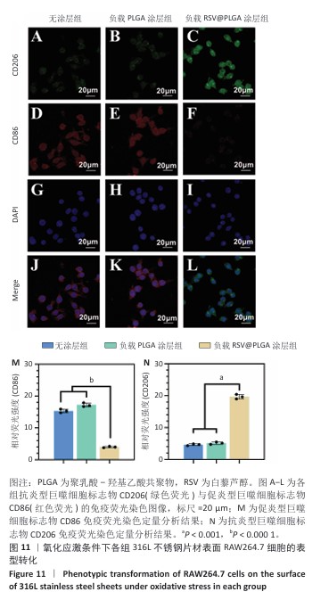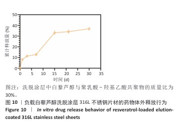方法:①配置白藜芦醇与聚乳酸-羟基乙酸共聚物质量比分别为0%,10%,20%,30%,40%的溶液,采用蒸发沉积法在316L不锈钢片材表面制备质量分数0%,10%,20%,30%,40%白藜芦醇洗脱涂层,表征5组涂层的水接触角、血液相容性、抗氧化特性以及对人脐静脉内皮细胞、人主动脉平滑肌细胞与巨噬细胞生长行为的影响,表征质量分数30%白藜芦醇洗脱涂层的药物释放动力学与机械性能;将巨噬细胞分别接种于316L不锈钢片材、负载聚乳酸-羟基乙酸共聚物涂层316L不锈钢片材与负载质量分数30%白藜芦醇洗脱涂层316L不锈钢片材表面,加入脂多糖刺激因子建立动脉粥样硬化模型,免疫荧光染色检测CD206(抗炎型巨噬细胞)、CD86(促炎型巨噬细胞)表达。②配置白藜芦醇与聚乳酸-羟基乙酸共聚物质量比分别为0%,30%的溶液作为喷涂液,采用超声雾化喷涂法在316L不锈钢支架表面制备质量分数0%,30%白藜芦醇洗脱涂层,通过球囊扩张实验评估涂层的机械性能。