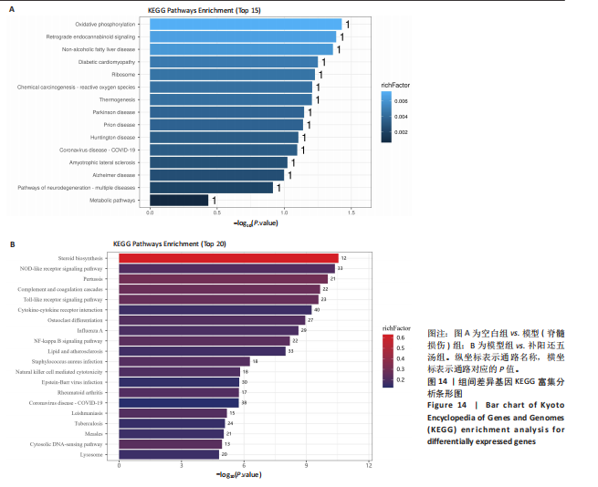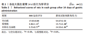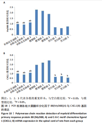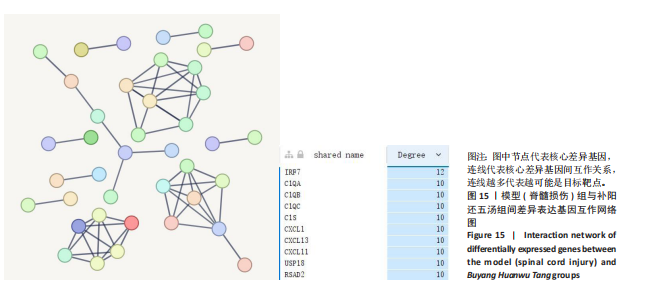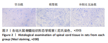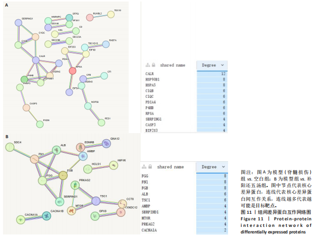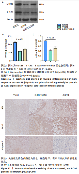 结果与结论:①运动学评分:与空白组对比,模型组大鼠下肢BBB运动评分明显较低(P < 0.001),斜板试验倾斜角度明显较小(P < 0.001);与模型组对比,补阳还五汤组大鼠下肢BBB运动评分较高(P < 0.05);斜板试验倾斜角度明显较大(P < 0.001)。病理形态学观察:空白组可见形态结构相对正常的神经元细胞,细胞结构完整,间隙正常,可见清晰的核仁核膜;模型组细胞坏死严重,结构紊乱,细胞核固缩,大部分核仁、核膜消失,存在大量组织空洞,有炎性细胞浸润;补阳还五汤组可见形态不规则、结构相对完整的神经元细胞,肿胀较轻,组织空洞和细胞坏死减少。②从GO功能注释和KEEG信号通路注释分析结果可知,差异蛋白质主要富集到急性期反应、蛋白质激活级联调节过程的调节、急性炎症反应的调节、血小板α颗粒、血液微粒、囊泡腔、丝氨酸型内肽酶抑制剂活性等分子功能,参与了map04142溶酶体、map04612抗原处理和呈递、map03013核质运输、map04964近端小管碳酸氢盐回收、map04610补体和凝血级联、ap00511其他聚糖降解、地图03040拼接体、map03410基底切除修复、map00531糖胺聚糖降解、冠状病毒病−COVID−19通路等信号通路;经过PPI构建,共分析出FGG、FN1、FGB、HSP90B1、CASP3等20个核心差异蛋白,FGG、FN1、FGB、CXCL1、CXCL13等20个核心差异基因。③Western blot检测表明补阳还五汤能够抑制脊髓组织中髓样分化因子88与P-IKBα蛋白的表达;免疫组化检测表明补阳还五汤能够抑制脊髓组织中BAX、Caspase-3蛋白的表达,促进BCL-2蛋白表达,抑制细胞凋亡;RT-PCR结果表明补阳还五汤能够抑制脊髓组织中髓样分化因子88、CXCL1的表达。上述结果提示,补阳还五汤可能通过抑制Toll样受体4/髓样分化因子88/核因子κB通路减轻炎症反应,通过调控BAX/BCL-2平衡,抑制Caspase-3表达阻止凋亡,从而保护脊髓组织。