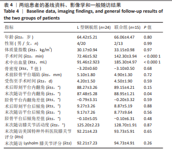 1.1.4 主要观察指标 临床方面评估术后及末次随访(12个月)的胫骨平台内翻角、后倾角,以及膝关节活动度、美国特种外科医院评分与Lysholm评分;同时记录手术时间与术中出血量。记录患者术后并发症,包括感染(定义为术后切口红肿、渗液或需额外抗生素治疗)、深静脉血栓(定义为下肢肿胀伴影像学确诊的血栓形成)、内固定失败(定义为螺钉松动或骨折移位塌陷> 2 mm),通过术后随访记录和影像学检查(X射线片)进行收集。