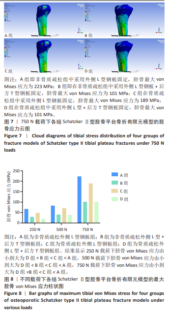 (1)左膝关节模型建立:将志愿者CT图像以DICOM格式导入Mimics 15.0软件中,通过阈值分割、区域增长及三维重建技术,构建胫骨三维模型。接着,利用3-matic 12.0软件生成了松质骨模型,并在Geomagic 2017软件中开发了对应的实体模型,这些模型随后被导入Solidworks 2021软件中,用于构建4组不同的内固定模型,并对所有部件进行了四面体网格化处理,采用Solid187网格类型。