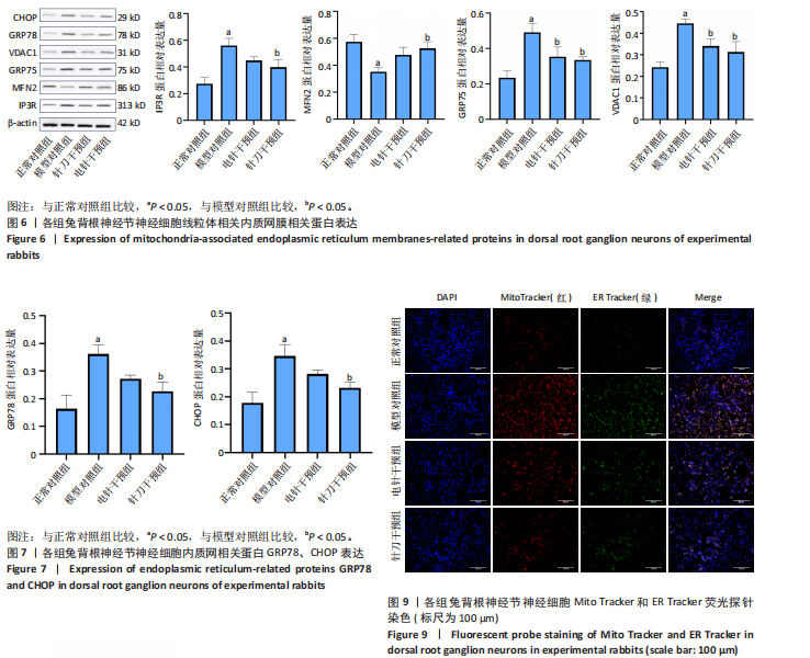 方法:将40只健康成年新西兰大白兔随机分为正常对照组(10只)和模型组(30只),模型组采用经典自体髓核移植方法进行造模,将造模成功兔随机分为模型对照组(10只)、电针干预组(10只)和针刀干预组(10只),造模后1周进行针刀、电针干预。干预3周后分离培养兔背根神经节细胞,采用TUNEL染色检测细胞凋亡情况,Western blot检测NLRP3、MAMs相关蛋白、内质网应激标志蛋白GRP78、特异性标志性蛋白CHOP,关键路径PERK轴之TXNIP蛋白表达水平,采用Mito Tracker和ER Tracker荧光探针染色和透射电镜观察线粒体内质网结构偶联,采用流式细胞仪分析Ca2+水平,采用活性氧探针染色检测活性氧含量。