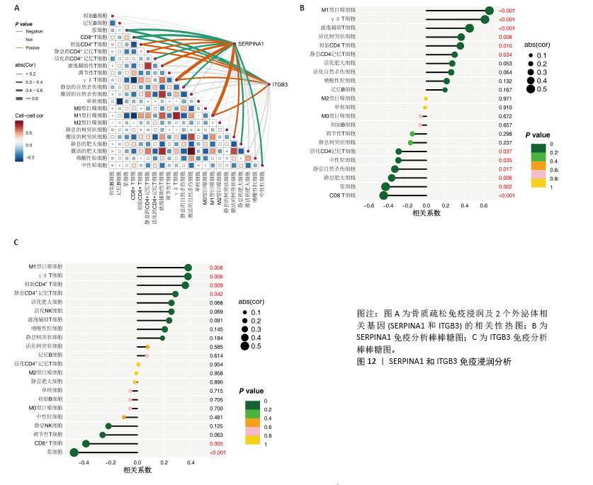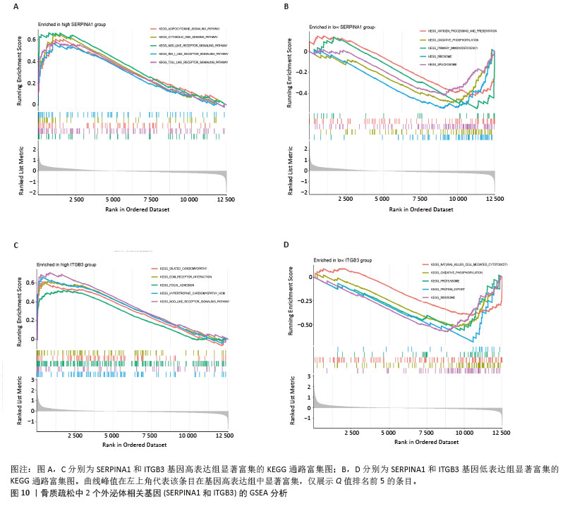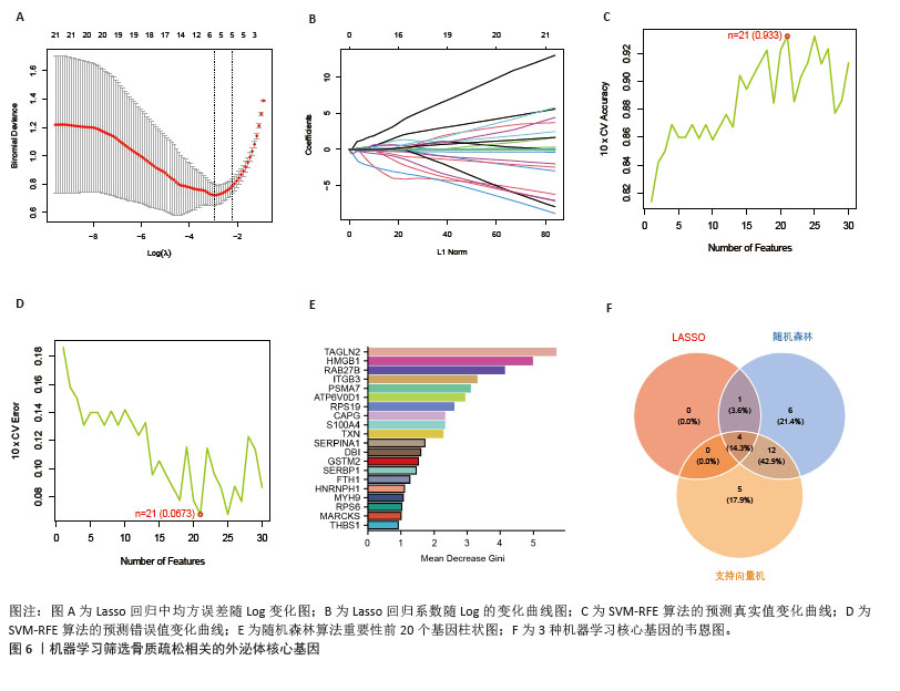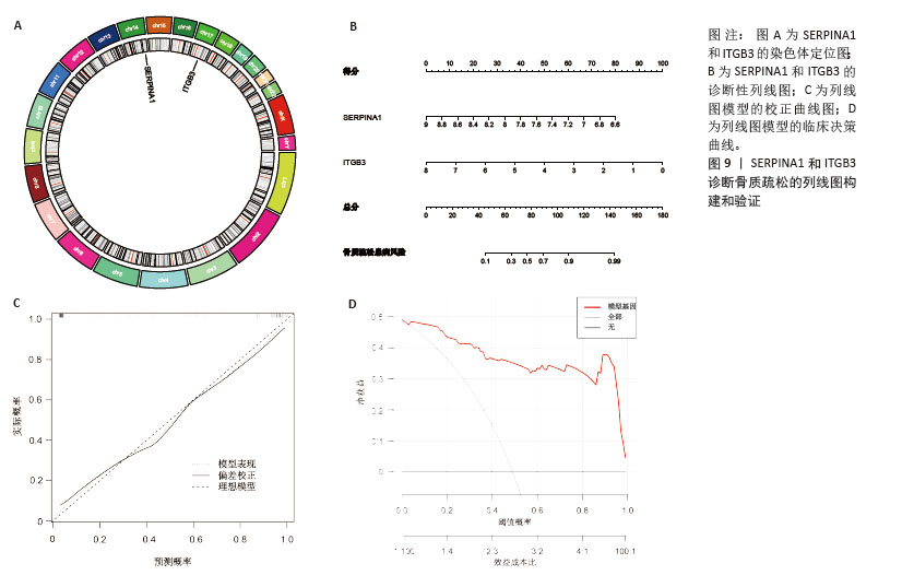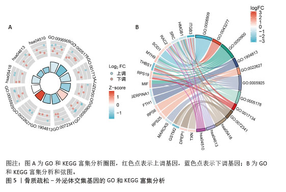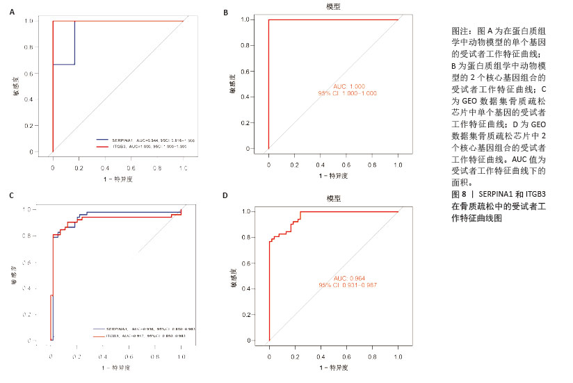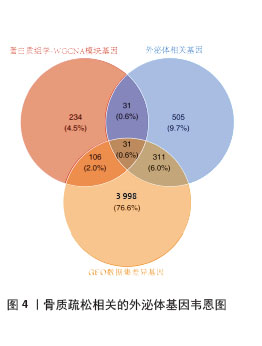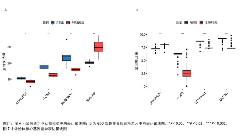 结果与结论:①4D-DIA蛋白质组学获得1 322个骨质疏松差异蛋白,加权基因共表达网络分析筛选出2个特征模块含402个基因,Gene Cards数据库整理出878个外泌体相关基因,GEO验证数据集差异分析获得4 447个差异蛋白,三部分基因取交集获得的31个基因为骨质疏松-外泌体相关基因;②相关基因的功能富集分析结果显示主要与中性粒细胞胞外陷阱的形成、Ras相关蛋白1信号通路、焦点黏附斑有关;③3种机器学习算法鉴定出4个骨质疏松-外泌体核心基因,其中在动物模型和GEO验证数据集中差异表达相同的有2个基因:ITGB3、SERPINA1。受试者工作特征曲线显示ITGB3、SERPINA1在动物模型、GEO验证数据集中皆具备较高的曲线下面积值,单个基因或2个基因组成的模型曲线下面积值皆大于0.9;④免疫浸润基因富集分析结果显示ITGB3、SERPINA1的高表达与M1型巨噬细胞呈正相关性,ITGB3、SERPINA1的高表达与NOD样受体信号通路有关;⑤基因结合蛋白调控网络显示ITGB3、SERPINA1共同调控HNRNPC、G3BP1、EIF3D、CTCF、U2AF2、MDTH等10个RNA结合蛋白;⑥两样本孟德尔随机化分析结果显示SERPINA1对骨质疏松表现出抑制作用,是骨质疏松的保护因素;⑦SERPINA1的药物富集分析结果显示有36种药物的P值< 0.05,分子对接发现有9种药物的结合能小于-29.4 kJ/mol,其中β-胡萝卜素与SERPINA1的结合能最强(-35.28 kJ/mol)。上述结果显示,ITGB3、SERPINA1是骨质疏松-外泌体核心基因,通过参与特定免疫过程、调控NOD样受体信号通路在疾病进展中发挥关键作用,对骨质疏松的诊断具有精准预测效果。