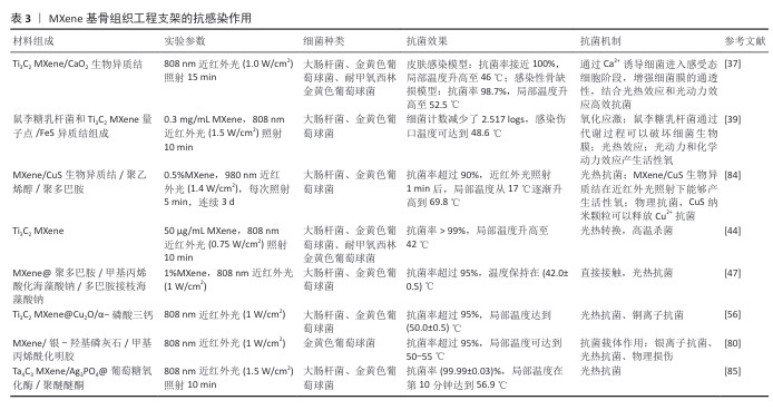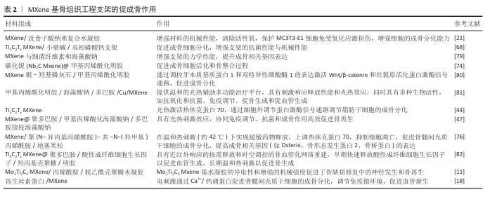 结果与结论:MXene具有良好的生物相容性、抗菌性、抗氧化和免疫调节性、光热性能和导电性能,将MXene引入骨组织工程支架的制备中可以赋予支架抗感染功能、免疫调节功能、增强的机械性能和促成骨能力。MXene作为引导骨再生膜材料有较大的应用潜力。MXene材料因具备优异的生物活性和抗菌性能是构建高性能植入物涂层的理想选择。MXene基3D打印墨水的成功制备为构建复杂结构的骨支架奠定了基础,MXene的优异性能赋予3D打印支架多重功能,使其在骨缺损修复中具备更广泛的应用前景。