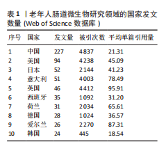 2.2 国家分析 通过对WOS数据库的文献分析可知,2014-2023年间,共有53个国家在老年人肠道微生物领域做出了贡献。其中,中国在该领域发表227篇,位居全球首位,占全球发表总量37.58%;美国94篇位列第二,约占15.56%。中美两国的发文量总和超过全球发文总量的一半,彰显出两国在该研究领域的重要地位。在所有文献发表的国家中,有30个国家的发文量超过5篇。借助VOSviewer对这些国家进行合作网络分析(图2),图中节点的大小与论文发表量呈正比,颜色的差异则表明节点所属的不同集群,线条的粗细映射了合作的紧密度,两节点间粗线条表明两国间的合作更为频繁。整理发文量前10的国家数据(表1),结合国家网络合作图谱可知,美国与多国合作关系最为密切,包括中国、德国、英国、印度、日本和加拿大等;英国的平均单篇引用量(n=95.91)最高,表明其发文质量较高,受到各国学者的广泛认可。尽管中国在该领域的发文量居世界首位,但在发文质量和国际合作方面仍有提升空间。鉴于此,中国应当把握肠道微生物研究的热点,及时跟进科研动态,并积极构建相关领域的国际合作网络,以增强科研能力和国际影响力。