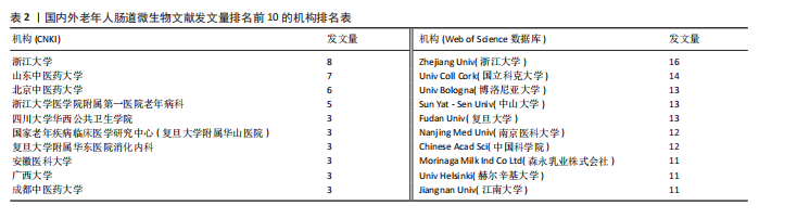 2.3 机构分布和合作分析 运用 VOSviewer对CNKI数据库中老年人肠道微生物领域发文数量≥2篇的35家机构分析(图3A)。在主要机构的合作网络图中,圆形节点的尺寸与发文量呈正相关,即节点越大,表明相应机构的发文量越多;而节点之间连线的粗细则反映机构之间联系的紧密程度,连线越粗,表明机构间的联系更为密切。此外,国内外发文量排名前10的机构排名见表2。其中,有24家机构的发文量仅为2篇。发文量排名前3的机构依次为浙江大学(8篇,3.2%)、山东中医药大学(7篇,2.8%)、北京中医药大学(6篇,2.4%)。整体而言,发文机构主要以国内的大学和大型三甲医院为主。各研究机构之间的联系相对较弱。与此同时,对WOS数据库中老年人肠道微生物领域发文量超过5篇的53家机构进行分析(图3B),中国的浙江大学发表文献数量最多,达16篇(2.6%);爱尔兰国立科克大学位列第2,发文量为14篇(2.3%);意大利的博洛尼亚大学位居第3,发文量为13篇(2.2%)。该图清晰地展示了不同国家机构之间已经形成一定规模的合作关系,且主要的合作关系集中在各国的顶尖高校之间。