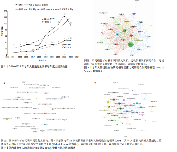 2.1 文献年发表数量 根据纳入的250篇中文文献和604篇英文文献的发表时间情况,绘制2012-2023年间发文量增长趋势统计图(图1),展示老年人肠道微生物领域的文献发表量随时间的变化趋势。图中虚线表示发文量与时间之间的指数增长模型,其中与英文文献年发表量相符的模型为y=1E-166e0.191 3x,R2=0.892 5,与中文文献年发表量相符的模型为y=3E-199e0.228x,R2=0.918 6。增长趋势均符合普赖斯指数增长模型。观察两条折线,分为3个阶段:2014-2017年为研究初期,发文量较少;2018-2022年为快速增长期,这一现象可能是由于高通量测序在该领域的运用,大幅缩短了研究周期以及大众健康意识提升引起;2023年WOS和CNKI数据库的发文量相较于普赖斯指数增长曲线出现下降趋势,这或许与新冠疫情对微生物学科的冲击较大有关。