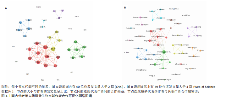 2.4 作者合著分析 在CNKI数据库中,共有625名作者在老年人肠道微生物领域做出贡献。对发文量≥2篇的作者进行分析(图4A),图中每个圆圈的大小直观地反映作者的发文数量,发文越多,对应的圆圈也就越大;同时,圆圈的不同颜色用于区分各个合作团队,主要研究团队包括杨云梅、李鸣、何方、肖振明和丁西平团队,其中,李鸣团队与何方团队之间的联系尤为紧密,双方在学术合作与互动方面较为频繁。
