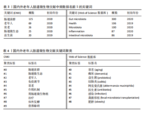 采用类似的方法对WOS数据库进行分析,共识别2 964个关键词,筛选出共现频数超过10的高频关键词91个,并绘制包含5个聚类和2 044条连线的网络共现图谱(图5B)。图谱中圆形面积大小与关键词的出现频数呈正比,其中频数最高的5个关键词(表3)为肠道菌群(gut microbiota)、健康(health)、微生物群(microbiota)、炎症(inflammation)和肠道微生物群(intestinal microbiota)。反映国际上该领域的研究主要集中在肠道微生物群的组成对老年人整体健康状况的影响,以及肠道微生物群失衡与老年人慢性炎症之间的关联。