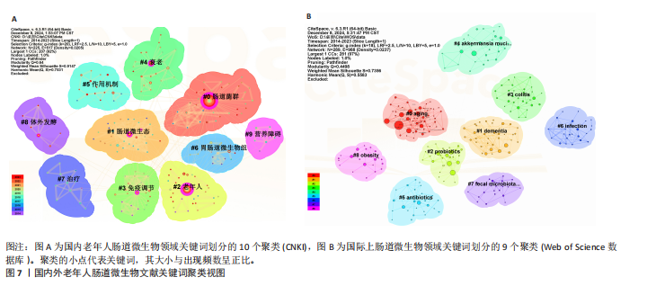 对国内数据聚类分析,得到Q=0.64、S=0.914 7(图7A),说明此聚类结构显著和具有较高的可信度。国内老年肠道微生物研究的学术领域被划分为10个主要的聚类(表4),#0肠道菌群包括16S rRNA、人类微生物组、菌群失调等;#1肠道微生态包括便秘、宏基因组学、益生菌制剂等;#2老年人包括健康老龄化、健康长寿、估算肾小球滤过率等;#3免疫调节包括益生菌、丁酸菌、s-层蛋白等;#4衰老包括慢性炎症、衰弱、核因子κB信号通路等;#5作用机制包括代谢途径、短链脂肪酸、氧化应激等;#6胃肠道微生物组包括双歧杆菌、乳酸菌、抗生素等;#7治疗包括健脾益肠汤、培菲康、中西医结合疗法等;#8体外发酵包括代谢产物、优势菌、膳食纤维复合体等;#9 营养障碍包括糖尿病(2型)、多器官功能障碍、炎症因子等。 #0、#1、#3、#6、#7、#8偏向于研究肠道微生态对健康的影响,而#2、#4、#5、#9则更加关注衰老过程中的健康问题及其机制。这些聚类模块共同反映了国内老年人肠道菌群研究的主要方向,聚焦于肠道微生态在衰老及相关疾病中的作用及干预策略。