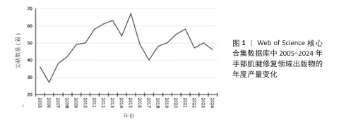 2.1 手部肌腱修复领域文献数量与趋势 2005-2024年间,手部肌腱修复领域相关文献的年度科研产出如图1所示,总体呈现波动增长的趋势。在研究初期阶段(2005-2010年),年度发表文献数量从不足40篇逐步增加至接近50篇,表明该领域逐渐引起研究者的关注。2010-2015年,手部肌腱修复领域文献数量保持稳步增长态势,并在2015年达到峰值。然而,自2016年起,手部肌腱修复领域文献发表数量波动较大,呈现下降趋势,虽然2021年出现了显著回落,但2022,2023年有所回升。