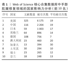 2.2 手部肌腱修复领域研究国家/地区分布 如表1显示,美国在手部肌腱修复领域的影响力最大,总被引次数达6 175,中国在领域内的学术影响力排名第二,总被引次数达2 204,日本则位列第三,总被引次数达1 003。