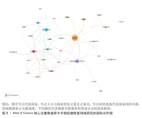通过分析手部肌腱修复领域的国际合作现状,发现该领域内具有显著的跨国合作特点(图2)。美国在全球研究网络中占据核心地位,中国、日本、韩国、新加坡等亚洲国家以及与德国、芬兰、瑞典土耳其等欧洲国家建立了紧密的合作关系,尤其是美国与亚洲国家之间的合作最为频繁,形成了强大的科研网络,体现了美国在该领域内的领导作用。
