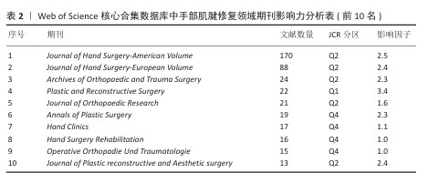 2.3 手部肌腱修复领域研究期刊分布 对手部肌腱修复领域发文量居前10位的期刊进行分析,见表2。《Journal of Hand Surgery-American Volume》的发文量位居首位(170篇),其次是《Journal of Hand Surgery-European Volume》(88篇)和《Archives of Orthopaedic and Trauma Surgery》(24篇)。上述3种期刊的JCR分区均为Q2。值得注意的是,位列Q1分区的期刊《Plastic and Reconstructive Surgery》,亦对该领域研究做出了重要贡献。