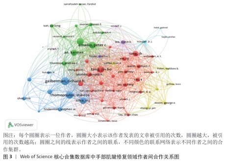 2.4 手部肌腱修复领域主要作者合作 通过VOSviewer对手部肌腱缝合领域的作者合作网络分析表明,该领域内已经形成多个显著的研究合作团体(图3)。Gelberman Richard H.和Zhao Chunfeng分别处于绿色和蓝色模块的核心位置。红色模块以Tang Jinbo为核心,该团队内合作紧密,显示出较高的学术影响力。相比之下,紫色和黄色模块的团队规模较小,但内部合作关系相对稳定。