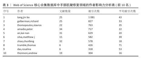 表3总结了“手部肌腱修复”领域内主要研究者的学术贡献及其影响力。从表中可以看出,tang,jin bo是该研究领域中最具影响力的研究者,其发表的25篇论文总被引次数达到1 081次。紧随其后的是gelberman,rh.和thomopoulos,stavros分别获得了827次和763次的引用。