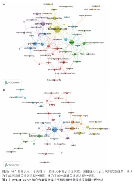 (1)手部屈肌腱修复领域关键词共现分析:见图4A。