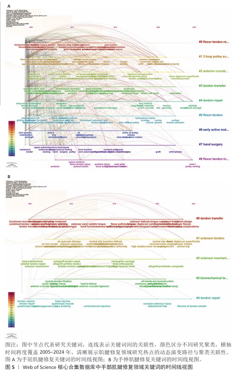 2.5.2 研究热点变迁 利用CiteSpace,通过关键词时间线可视化分析功能分别构建了手部屈肌腱与伸肌腱研究热点的年度演变图。