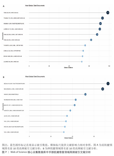 2.5.4 共被引文献分析 手部肌腱修复领域Bibliometrix共被引文献分析显示(图7),屈肌腱领域排名前10的高频被引文献引用频次