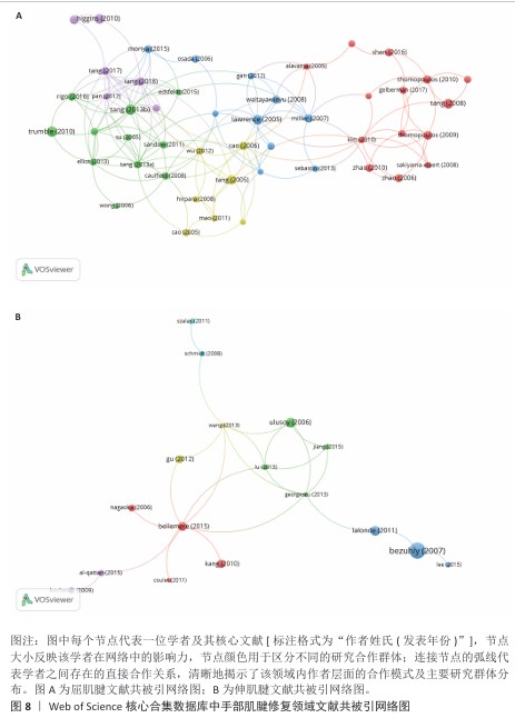 为揭示核心文献的共引网络结构,分别选取引用频次≥40次的屈肌腱相关文献以及≥5次的伸肌腱相关文献构建文献共被引网络图(图8)。在屈肌腱修复领域,核心文献节点间存在显著的共引关联,例如:Tang (2013年)与Sandow (2011年)、Cao (2006年)、Miller (2007年) 以及 Gelberman (2017年)等文献形成紧密的共引关系。在伸肌腱修复领域,核心文献节点Gu (2012年)、Bellemere (2015年)、Lu (2013年)与Ulusoy (2006年)、Georgescu (2013年)等同样存在密切的共被引关系。