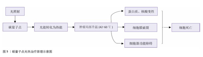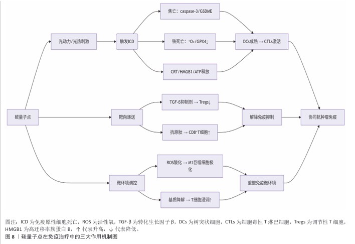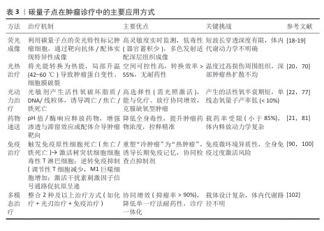 结果与结论:碳量子点的常见制备方法有自上而下法和自下而上法,自上而下法是以大体积的碳材料为前体(如石墨、碳纤维、碳纳米管、石墨烯等),利用电弧放电、电化学、激光烧蚀和其他技术制备更小尺寸的碳量子点;自下而上法是将小分子有机分子或生物质的碳化来合成碳量子点,主要包括水热法、微波法、模板法等。在肿瘤诊疗中,碳量子点通过多机制协同发挥作用:在荧光成像中,碳量子点作为荧光探针标记肿瘤细胞,实现早期诊断和实时监测;在光热治疗中,利用碳量子点的光热转换效率将光能转化为热能杀伤肿瘤细胞;在光动力治疗中,碳量子点产生活性氧破坏肿瘤细胞生物大分子;作为药物载体,碳量子点能靶向递送抗肿瘤药物至肿瘤部位,减少不良反应;在免疫治疗方面,通过触发免疫原性死亡、逆转免疫抑制微环境及激活干扰素刺激因子通路,将“冷肿瘤”转化为“热肿瘤”;在多模态治疗中,碳量子点通过整合化疗、光疗、免疫治疗实现高效抑瘤率。