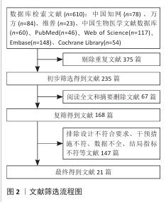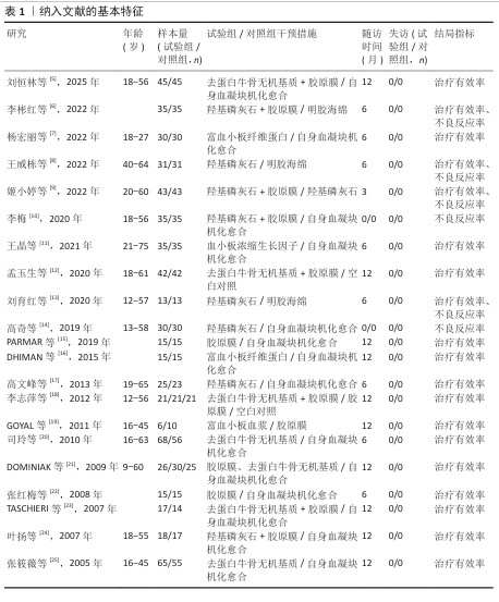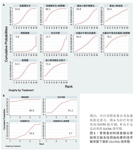 结果:共纳入21项研究,包含1 286例患者,涉及10种干预措施:羟基磷灰石、去蛋白牛骨无机基质、胶原膜、羟基磷灰石+胶原膜、去蛋白牛骨无机基质+胶原膜、血小板浓缩生长因子、富血小板纤维蛋白、明胶海绵、空白对照(血凝块机化愈合)、富血小板血浆。网状Meta分析结果显示:①治疗有效率由高到低排序前三为:羟基磷灰石+胶原膜>去蛋白牛骨无机基质+胶原膜>血小板浓缩生长因子;②不良反应率由高到低排序为:明胶海绵>空白对照>羟基磷灰石>羟基磷灰石+胶原膜。