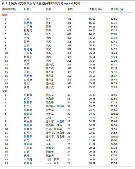 结果与结论:①共纳入503份病历与90篇文献;②证候分析显示:儿童脑瘫所表现中医证型主要为肝肾不足证;③干预措施分析显示:以外治法使用频率最高,内服药物治疗中则以补益肝肾类中药最为常见;④用药规律分析显示:在病历与文献使用频次前20味药物中有12味(60%)相同;山药与茯苓、熟地与茯苓2个药对的支持度皆较高,且置信度高于82.50%,这2个药对具有显著关联性;治疗儿童脑瘫的所有中药中,性以温为主,平、寒次之;味以甘为主,苦、辛次之;归经以肝、肾经为主,脾、心、肺经次之;这些中药组方中基本为无毒药物。结果表明:儿童脑瘫主要表现为肝肾不足,中医临床实践及相关临床研究所使用的方剂多为补益肝肾类,其中六味地黄丸及其衍生方的出现频次最高,配伍以熟地与茯苓、山药与茯苓2个药对使用频率与可靠程度最高,药材性味以温、甘、归肝肾经为主。