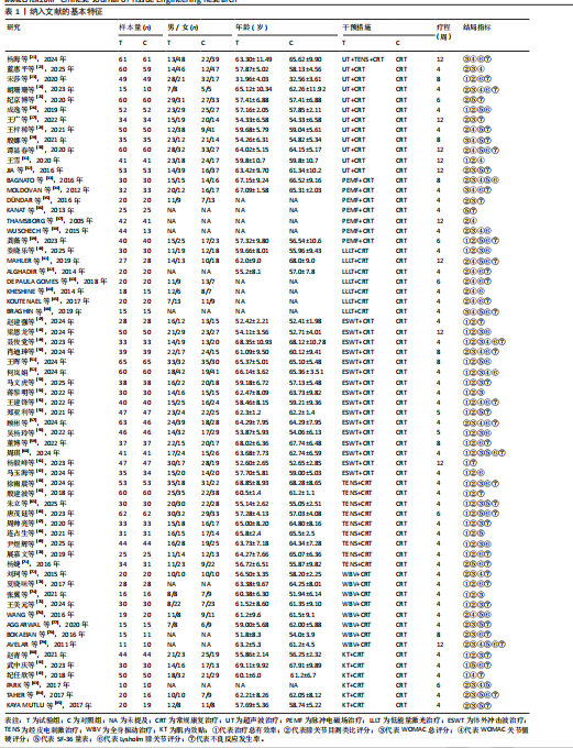 方法:应用计算机检索PubMed、Web of Science、Cochrane Library、EMbase数据库以及中国知网、维普数据库、万方数据库、中国生物医学文献服务系统,选择各数据库建库至2025-07-25有关物理因子治疗膝骨关节炎的随机对照试验,筛选文献及提取数据后,通过Cochrane推荐的风险偏倚评价工具评估纳入文献的质量,采用Stata 16.0、RevMan 5.4.1软件进行统计学分析。