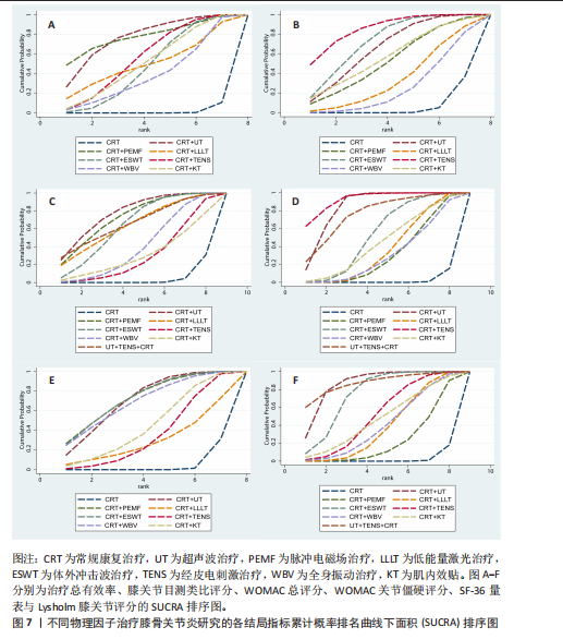 结论:经皮电刺激联合常规康复治疗在改善膝骨关节炎患者目测类比评分与WOMAC关节僵硬评分方面显示出较高的优势;超声波联合常规康复治疗在改善Lysholm膝关节评分及WOMAC总评分方面的表现相对较好;脉冲电磁场联合常规康复治疗在改善膝骨关节炎患者整体生活质量方面具有一定的潜在优势,每种物理因子都有其独特的优势,但受纳入文献质量与数量限制,上述结论有待更多高质量、多中心、大样本的随机对照试验加以验证。