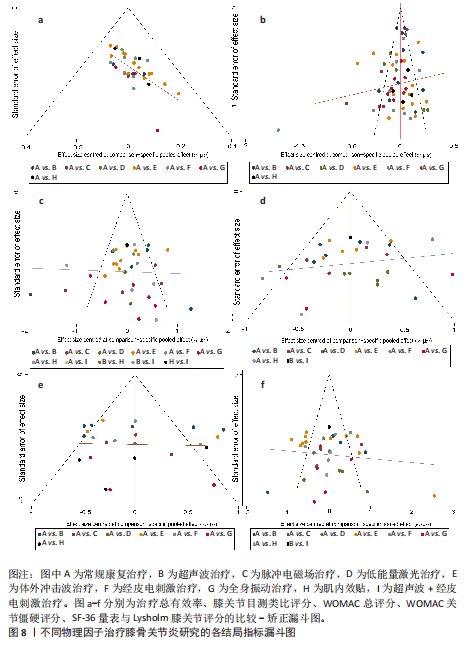 RESULTS: (1) A total of 65 randomized controlled trials involving 3 418 patients were included, with 1 726 in the intervention group and 1 692 in the control group, covering 7 types of physical factor-based rehabilitation regimens. (2) For overall clinical response rate, the top three interventions ranked by the surface under the cumulative ranking curve were pulsed electromagnetic field therapy > ultrasound therapy > transcutaneous electrical stimulation, each combined with conventional rehabilitation. For reduction in knee pain assessed by the visual analogue scale, the top three interventions ranked by the surface under the cumulative ranking curve were transcutaneous electrical stimulation > extracorporeal shock wave therapy > ultrasound, each combined with conventional rehabilitation. For improvement in total Western Ontario and McMaster Universities Arthritis Index scores, the top three interventions ranked by the surface under the cumulative ranking curve were ultrasound > pulsed electromagnetic field therapy > ultrasound plus transcutaneous electrical stimulation, each combined with conventional rehabilitation. For reduction in Western Ontario and McMaster Universities Arthritis Index stiffness subscale scores, the top three interventions ranked by the surface under the cumulative ranking curve were transcutaneous electrical stimulation > ultrasound > ultrasound plus transcutaneous electrical stimulation, each combined with conventional rehabilitation. For improvement in 36-Item Short Form Survey quality-of-life scores, the top three interventions ranked by the surface under the cumulative ranking curve were pulsed electromagnetic field therapy > extracorporeal shock wave therapy > ultrasound, each combined with conventional rehabilitation. For improvement in Lysholm knee scores, the top three interventions ranked by the surface under the cumulative ranking curve were ultrasound > ultrasound plus transcutaneous electrical stimulation > extracorporeal shock wave therapy, each combined with conventional rehabilitation. No serious adverse events were reported across the included studies; most trials only documented mild skin irritation or allergic reactions.