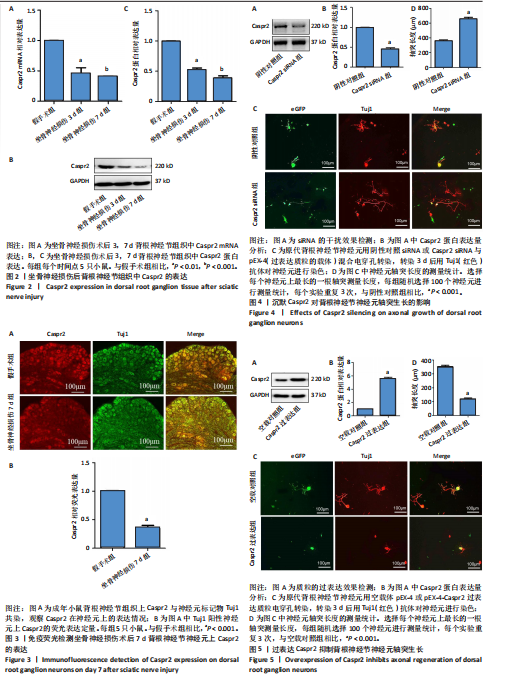 方法:建立ICR小鼠坐骨神经钳夹损伤模型,采用qRT-PCR和Western blot分析背根神经节组织中Caspr2的转录及蛋白表达特征,采用免疫荧光染色分析背根神经节神经元中Caspr2的表达。通过原代背根神经节神经元培养体系构建干预模型:Caspr2 siRNA阴性对照组、Caspr2 siRNA组;Caspr2空载对照组、Caspr2过表达组,结合Tuj1免疫荧光染色和AxioVision图像分析系统定量评估轴突再生动力学变化。