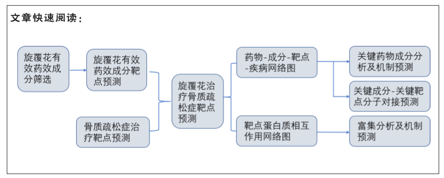 方法:通过TCMSP数据库筛选旋覆花有效成分,TCMSP和Swiss Target Prediction数据库预测有效成分作用靶点,GeneCards数据库和 DrugBank数据库预测骨质疏松症作用靶点,String数据库构建蛋白质互作网络分析,Cytoscape软件构建蛋白质互作网络图和药物-成分-靶 点-疾病网络图,David数据库进行富集分析,autodock vina软件进行分子对接预测。