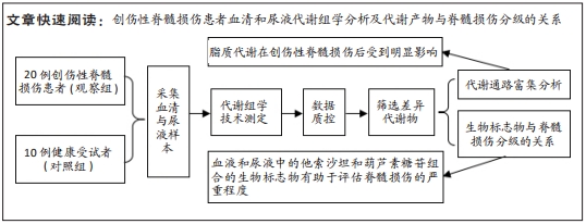 目的:使用代谢组学技术来表征创伤性脊髓损伤患者的代谢特征,探寻潜在的生物标志物及失调的代谢途径。结果与结论:两组受试者的血清和尿液中分别检测出160种和73种具有显著差异的代谢物。通路富集分析显示,创伤性脊髓损伤后脂质代谢出现明显的紊乱,包括鞘脂类、亚油酸、α-亚麻酸和花生四烯酸代谢以及糖基磷脂酰肌醇生物合成。识别出他索沙坦和葫芦素糖苷这组生物标志物,并且二者构成的代谢物组合在血清和尿液中的水平与ASIA分级存在相关性。由此可见,代谢组学技术为进一步理解创伤性脊髓损伤病理机制、筛选治疗靶点提供帮助。识别出的代谢生物标志物组合可能为评估创伤性脊髓损伤的严重程度提供参考。