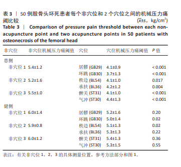 方法:测量50例股骨头坏死患者患侧和非患侧6个穴位及3个非穴位的机械压力痛阈值,患侧6个常用于治疗股骨头坏死的髋部局部穴位包括承扶(BL36)、秩边(BL54)、居髎(GB29)、环跳(GB30)、气冲(ST30)和髀关(ST31),同时也选定了髋关节前侧、外侧和后侧每侧各一个,共3个非穴位点。同时测量50例与患者在性别和年龄上匹配的健康对照受试者相同部位的痛阈值。所有测量均在单一时间点进行。