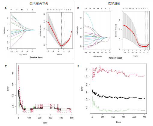 方法:从GEO数据库(由美国国立医学图书馆开发的开放数据库)中检索获得类风湿关节炎与克罗恩病对应的训练数据集和验证集(研究已获得相关机构审查委员会批准),并进行统一整理,使用“limma”包分析类风湿关节炎、克罗恩病的差异表达基因。分别在类风湿关节炎与克罗恩病的训练集上应用加权基因共表达网络分析识别疾病相关模块,取交集初步筛选基因集,同时进行GO、KEGG分析。通过蛋白质互作网络及MCODE算法识别出20个基因集,分别在类风湿关节炎与克罗恩病的训练集上应用LASSO回归和随机森林两种机器学习算法独立筛选各自疾病的关键特征基因。取类风湿关节炎与克罗恩病筛选结果交集,获得共有的潜在关键基因,通过验证集验证准确度确定核心基因。对核心基因与浸润免疫细胞进行CIBERSORT免疫浸润等功能分析,确定核心基因与类风湿关节炎、克罗恩病的相关性。
