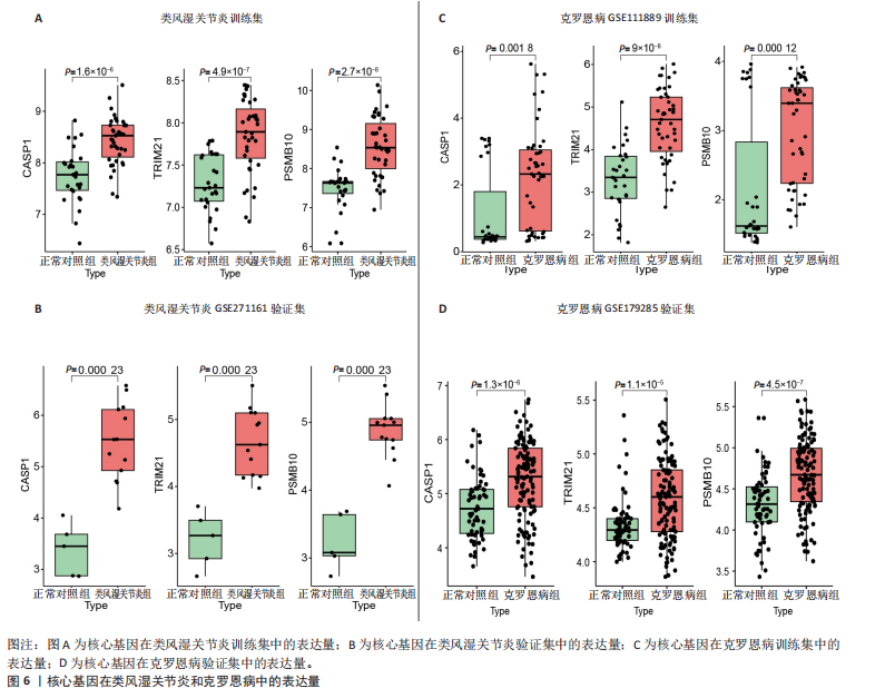 RESULTS AND CONCLUSION: A total of 2 516 differentially expressed genes were obtained for rheumatoid arthritis, and 281 differentially expressed genes for Crohn’s disease. Following intersection analysis using WGCNA, protein-protein interaction network, and two machine learning algorithms, three core genes were identified: CASP1, TRIM21, and PSMB10. Enrichment analysis showed that the two diseases were associated with antigen processing and presentation, luminal side of endoplasmic reticulum membrane, and binding to multiple immunoglobulins. The expression trends of three core genes in the validation sets of the two diseases were consistent with those in the training set. Immune cell infiltration analysis revealed significantly increased expression of M0 macrophages, M1 macrophages, and neutrophils in both rheumatoid arthritis and Crohn’s disease. This indicates that neutrophils may play an important role in the pathogenesis of rheumatoid arthritis and Crohn’s disease. This study not only enhances our understanding of the commonalities between two important autoimmune diseases, but more importantly, it provides valuable insights and specific guidance for Chinese researchers in the discovery and validation of new targets, the development of novel diagnostic and therapeutic technologies, and the application of translational medicine research models.