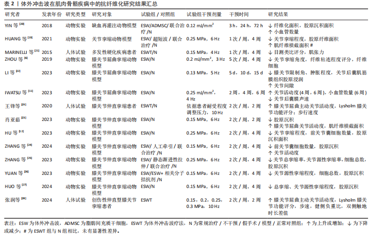 | [1] LURJE I, GAISA NT, WEISKIRCHEN R, et al. Mechanisms of organ fibrosis: Emerging concepts and implications for novel treatment strategies. Mol Aspects Med. 2023;92:101191. [2] KU JC, RAITEN J, LI Y. Understanding fibrosis: Mechanisms, clinical implications, current therapies, and prospects for future interventions. Biomed Eng Adv. 2024;7:100118. [3] YOUNESI FS, MILLER AE, BARKER TH, et al. Fibroblast and myofibroblast activation in normal tissue repair and fibrosis. Nat Rev Mol Cell Biol. 2024;25(8):617-638. [4] DEMUYNCK L, MOONEN S, THIESSEN F, et al. Systematic Review on Working Mechanisms of Signaling Pathways in Fibrosis During Shockwave Therapy. Int J Mol Sci. 2024;25(21):11729. [5] DARBY IA, LAVERDET B, BONTÉ F, et al. Fibroblasts and myofibroblasts in wound healing. Clin Cosmet Investig Dermatol. 2014;7:301-311. [6] ZHOU Y, YANG K. Prevention of arthrofibrosis during knee repair by extracorporeal shock wave therapy: Preliminary study in rabbits. Injury. 2019;50(3):633-638. [7] JESCHKE MG, WOOD FM, MIDDELKOOP E, et al. Scars. Nat Rev Dis Primers. 2023;9(1):64. [8] D’AGOSTINO MC, CRAIG K, TIBALT E, et al. Shock wave as biological therapeutic tool: From mechanical stimulation to recovery and healing, through mechanotransduction. Int J Surg. 2015;24(Pt B):147-153. [9] 梁豪君,贾海光,朱俊宇,等.中国骨肌疾病体外冲击波疗法指南(2023年版)[J].中国医学前沿杂志(电子版),2023,15(9):1-20. [10] 程志祥,樊肖冲,冯智英,等.体外冲击波疗法临床应用中国疼痛学专家共识(2023版)[J].中华疼痛学杂志,2023, 19(2):220-235. [11] IWATSU J, YABE Y, KANAZAWA K, et al. Extracorporeal shockwave therapy in an immobilized knee model in rats prevents progression of joint contracture. J Orthop Res. 2023;41(5):951-961. [12] HU C, ZHANG QB, WANG F, et al. The effect of extracorporeal shock wave on joint capsule fibrosis in rats with knee extension contracture: a preliminary study. Connect Tissue Res. 2023;64(5):469-478. [13] ROQUES C. Scars, physiology, classification and assessment. Soins. 2013;(772):30-33. [14] ZHAO JC, ZHANG BR, HONG L, et al. Extracorporeal shock wave therapy with low-energy flux density inhibits hypertrophic scar formation in an animal model. Int J Mol Med. 2018;41(4):1931-1938. [15] LEE SY, JOO SY, CHO YS, et al. Effect of extracorporeal shock wave therapy for burn scar regeneration: A prospective, randomized, double-blinded study. Burns. 2021;47(4):821-827. [16] WANG CJ, KO JY, CHOU WY, et al. Extracorporeal shockwave therapy for treatment of keloid scars. Wound Repair Regen. 2018;26(1):69-76. [17] KIM DH, HAN SH, SUH HS, et al. Benefits of extracorporeal shock waves for keloid treatment: A pilot study. Dermatol Ther. 2020;33(4):e13653. [18] SAGGINI R, SAGGINI A, SPAGNOLI AM, et al. Extracorporeal Shock Wave Therapy: An Emerging Treatment Modality for Retracting Scars of the Hands. Ultrasound Med Biol. 2016;42(1):185-195. [19] HUANG PP, ZHANG QB, ZHOU Y, et al. Effect of Radial Extracorporeal Shock Wave Combined With Ultrashort Wave Diathermy on Fibrosis and Contracture of Muscle. Am J Phys Med Rehabil. 2021; 100(7):643-650. [20] YIN TC, WU RW, SHEU JJ, et al. Combined Therapy with Extracorporeal Shock Wave and Adipose-Derived Mesenchymal Stem Cells Remarkably Improved Acute Ischemia-Reperfusion Injury of Quadriceps Muscle. Oxid Med Cell Longev. 2018;2018:6012636. [21] MARINELLI L, MORI L, SOLARO C, et al. Effect of radial shock wave therapy on pain and muscle hypertonia: a double-blind study in patients with multiple sclerosis. Mult Scler. 2015;21(5):622-629. [22] LI Y, LIAO Q, ZENG J, et al. Extracorporeal Shock Wave Therapy Improves Nontraumatic Knee Contracture in a Rat Model. Clin Orthop Relat Res. 2023;481(4): 822-834. [23] 肖亚茹.体外冲击波治疗通过对HIF-1α、NLRP3表达的调控减轻大鼠膝关节伸直固定诱导的肌源性挛缩[D].合肥:安徽医科大学,2023. [24] ZHANG R, ZHANG R, ZHOU T, et al. Preliminary investigation on the effect of extracorporeal shock wave combined with traction on joint contracture based on PTEN-PI3K/AKT pathway. J Orthop Res. 2024;42(2):339-348. [25] ZHANG R, ZHANG QB, ZHOU Y, et al. Possible mechanism of static progressive stretching combined with extracorporeal shock wave therapy in reducing knee joint contracture in rats based on MAPK/ERK pathway. Biomol Biomed. 2023;23(2):277-286. [26] YUAN H, WANG K, ZHANG QB, et al. The effect of extracorporeal shock wave on joint capsule fibrosis based on A2AR-Nrf2/HO-1 pathway in a rat extending knee immobilization model. J Orthop Surg Res. 2023;18(1):930. [27] HUO L, ZHANG QB, ZHU DT, et al. Preliminary study of extracorporeal shock wave alleviating joint capsule fibrosis caused by internal bleeding of knee joint in rats. Connect Tissue Res. 2024;65(5):397-406. [28] 张润,张全兵,周云,等.不同强度体外冲击波治疗创伤性伸直型膝关节挛缩的疗效分析[J].中国康复医学杂志,2024, 39(11):1625-1631. [29] 王锋,张全兵,周云,等.发散式冲击波联合常规康复治疗创伤后膝关节伸直挛缩的疗效观察[J].中国骨与关节损伤杂志,2020,35(2):187-189. [30] ZHAO Y, SANTELLI A, ZHU XY, et al. Low-Energy Shockwave Treatment Promotes Endothelial Progenitor Cell Homing to the Stenotic Pig Kidney. Cell Transplant. 2020;29:963689720917342. [31] KWON SH, LERMAN LO. Atherosclerotic renal artery stenosis: current status. Adv Chronic Kidney Dis. 2015;22(3):224-231. [32] CHEN XJ, ZHANG X, JIANG K, et al. Adjunctive mesenchymal stem/stromal cells augment microvascular function in poststenotic kidneys treated with low-energy shockwave therapy. J Cell Physiol. 2020;235(12):9806-9818. [33] CHEN XJ, ZHANG X, JIANG K, et al. Improved renal outcomes after revascularization of the stenotic renal artery in pigs by prior treatment with low-energy extracorporeal shockwave therapy. J Hypertens. 2019;37(10): 2074-2082. [34] ZHANG X, KRIER JD, AMADOR CARRASCAL C, et al. Low-Energy Shockwave Therapy Impro
