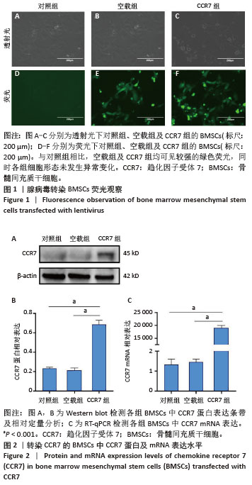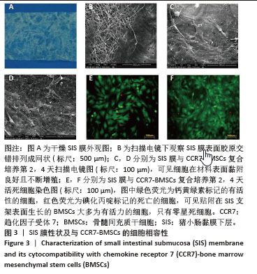 结果与结论:①通过腺病毒介导成功构建过表达趋化因子受体7的骨髓间充质干细胞,趋化因子受体7转染组细胞内趋化因子受体7的蛋白、mRNA表达均较对照组和空载组明显上调(P < 0.001);②扫描电镜观察及活死细胞染色实验结果显示过表达趋化因子受体7的骨髓间充质干细胞在猪小肠黏膜下层膜表面生长良好,二者具有良好的相容性;③与对照组相比,实验组创面面积明显缩小(P < 0.05),实验组创面愈合组织中血管内皮生长因子、CD31、增殖细胞核抗原的蛋白表达高于对照组(P < 0.05),表明趋化因子受体7-骨髓间充质干细胞-猪小肠黏膜下层膜的促创面血管生成能力较强。