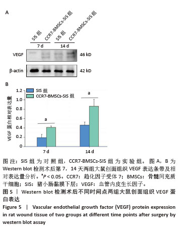 方法:①过表达趋化因子受体7腺病毒载体转染骨髓间充质干细胞,Western blot及RT-qPCR方法评价转染效果;②将过表达趋化因子受体7的骨髓间充质干细胞与猪小肠黏膜下层复合培养,通过扫描电镜观察及活死细胞染色验证细胞相容性;③12只SD大鼠构建皮肤缺损动物模型,分别将趋化因子受体7-骨髓间充质干细胞-猪小肠黏膜下层(实验组)和猪小肠黏膜下层(对照组)置于大鼠皮肤缺损处,造模后1,3,7,14 d观察创面愈合情况,造模后7,14 d采用Western blot检测创面愈合组织中血管内皮生长因子蛋白表达,免疫组化染色检测创面组织CD31及增殖细胞核抗原蛋白表达。