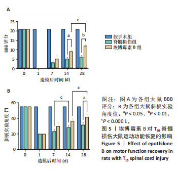 斜板实验:由于操作简单、可重复性高且与脊髓损伤相关性较好,斜板实验常被用来作为测试大鼠脊髓损伤后后肢肌力的一种方法。造模前及造模后第1,7,14,28天,将大鼠身体纵轴与斜板长轴保持一致,从0°开始,自大鼠头侧抬高斜板,每次抬高5°。对于每个位置,大鼠若能保持5 s身体不向下滑落则记为成功。记录大鼠在斜板上保持姿势的最大角度,该角度越大说明大鼠后肢的承重能力越强。每只动物测试3次,取平均值。