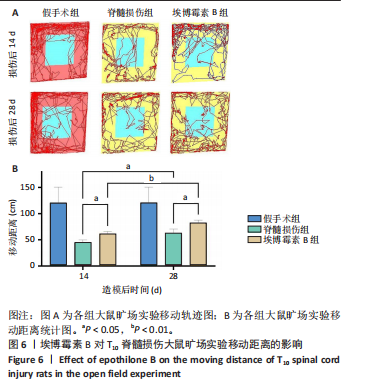 旷场实验:造模后第14,28天,将大鼠放入旷场中,用摄像头观察并记录大鼠的运动轨迹,时长为300 s,结束后导出大鼠的运动距离及运动轨迹图,作为脊髓损伤后运动功能恢复的指标。每组实验后用卫生纸擦净大鼠残留的粪便、尿液等,避免对下次实验造成影响。