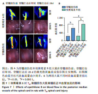 1.4.2 激光散斑血流成像 造模前后与造模后28 d,对埃博霉素B组和脊髓损伤组大鼠脊髓开展激光散斑血流检测,检测对象为脊髓背侧的正中血管。首先,利用激光散斑观测仪自带的红色激光进行定位,当电脑屏幕视野中出现手术切口后,切换至照明灯并放大画面,使用系统自带的图形工具在实物图中划定感兴趣区域,待血流平稳后记录60 s的数据。系统会自动绘制出这60 s内感兴趣区域的平均血流变化曲线。随后,从中选取最为平稳的20 s数据进行统计分析,系统将生成一个Excel表格,表格中包含该时间段内血流的最大值、最小值、均值以及方差等数据。为更直观地呈现脊髓打击前后的情况,需导出彩图及实物图(图4) 。