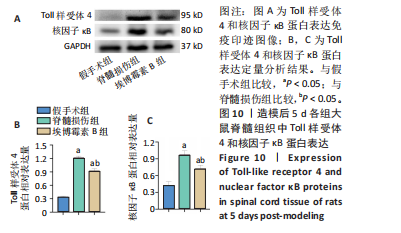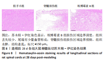 1.4.4 组织学检查 造模后第28天,每组随机取3只大鼠取材,进行苏木精-伊红染色。造模后第5天,假手术组随机取3只大鼠,脊髓损伤组与埃博霉素B组各随机取6只大鼠取材,进行免疫荧光染色。造模后第5天,每组随机取3只大鼠取材,进行Western Blot检测。