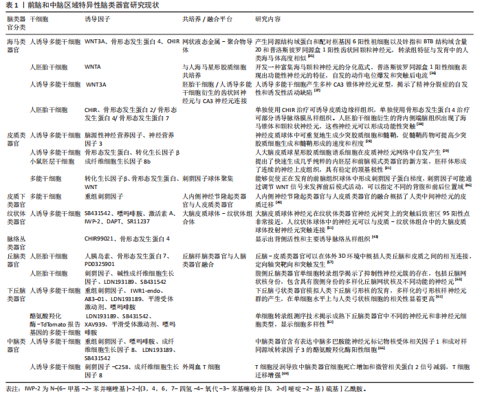 结果与结论:①背侧前脑类器官模拟皮质神经上皮,分化成星形胶质细胞、兴奋性神经元和少突胶质细胞等神经细胞,腹侧前脑类器官模仿神经节隆起,发育为基底神经节和纹状体,表现出广泛的神经元迁移并保持γ-氨基丁酸能特性;②人诱导多能干细胞产生的海马类器官移植可与小鼠海马体神经回路功能整合,接受兴奋性输入,形成具有突触连接的神经元网格;③丘脑/下丘脑类器官模拟人类下丘脑弓状核的发育、细胞多样性并探究多巴胺能神经元特异性;④中脑类器官广泛应用于帕金森病的建模、基因编辑和药物开发的研究中;⑤糖氧剥夺可诱导脑类器官体外模拟缺血性脑卒中,进而通过凋亡、坏死性凋亡、自噬和铁死亡等死亡途径参与神经损伤;糖氧剥夺处理后的脑类器官基因表达谱发生显著变化;应用鼠尾草酸等神经保护药物或在大脑中动脉闭塞大鼠体内移植脑类器官可改善大鼠的神经功能损伤,减少梗死体积,在移植再生医学领域发挥重要作用。