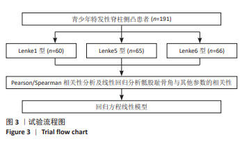 方法:回顾性分析191例青少年特发性脊柱侧凸患者的临床及影像学资料,其中Lenke1型60例、Lenke5型65例、Lenke6型66例。采用Pearson或Spearman分析各分型患者左右侧骶股耻骨角与骨盆入射角、骨盆倾斜角、骶骨倾斜角、腰椎前凸角、胸椎后凸角、Cobb角、矢状面轴向偏距的相关性,对有统计学意义的参数进行一元线性回归分析,构建线性回归模型。